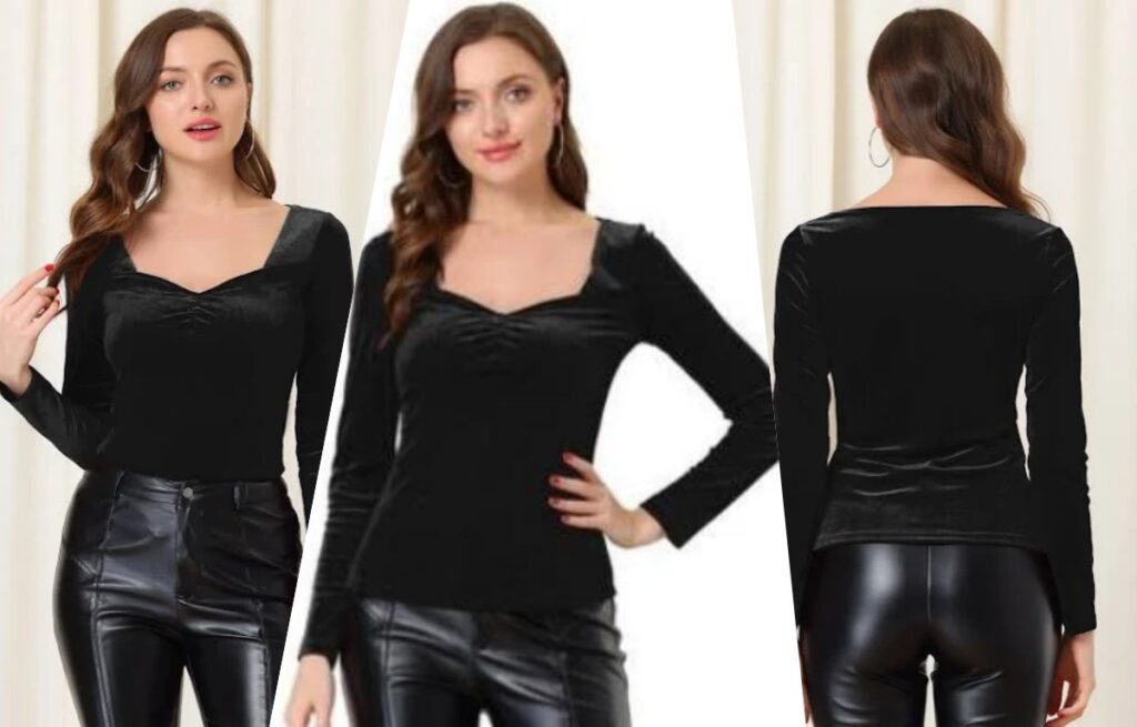 Sweetheart neck T-shirts are easy to recognize: the neckline curves downward in two arches, meeting at a soft point in the center. This shape mimics the top of a heart, framing the bust and collarbone beautifully.