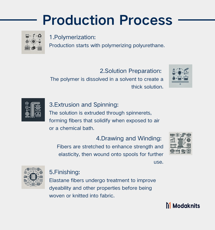 - Polymerization: The production begins with the polymerization of polyurethane, where polyols and diisocyanates are combined to create long polymer chains that form the base material for elastane fibers.