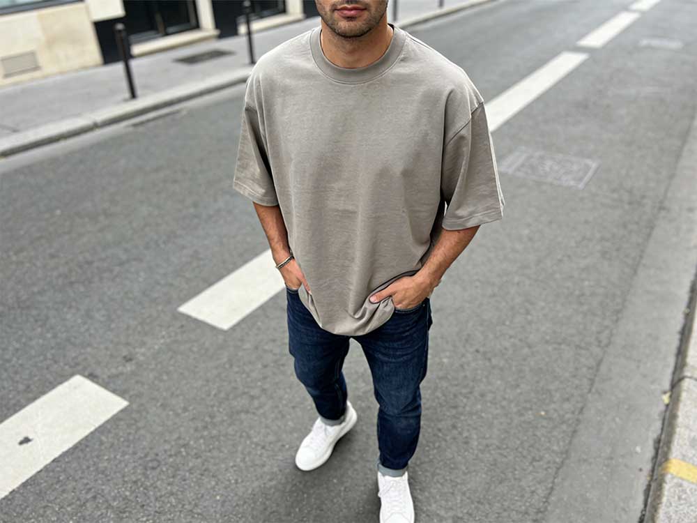 A well-proportioned oversized cotton T-shirt remains visually neat when worn alone.