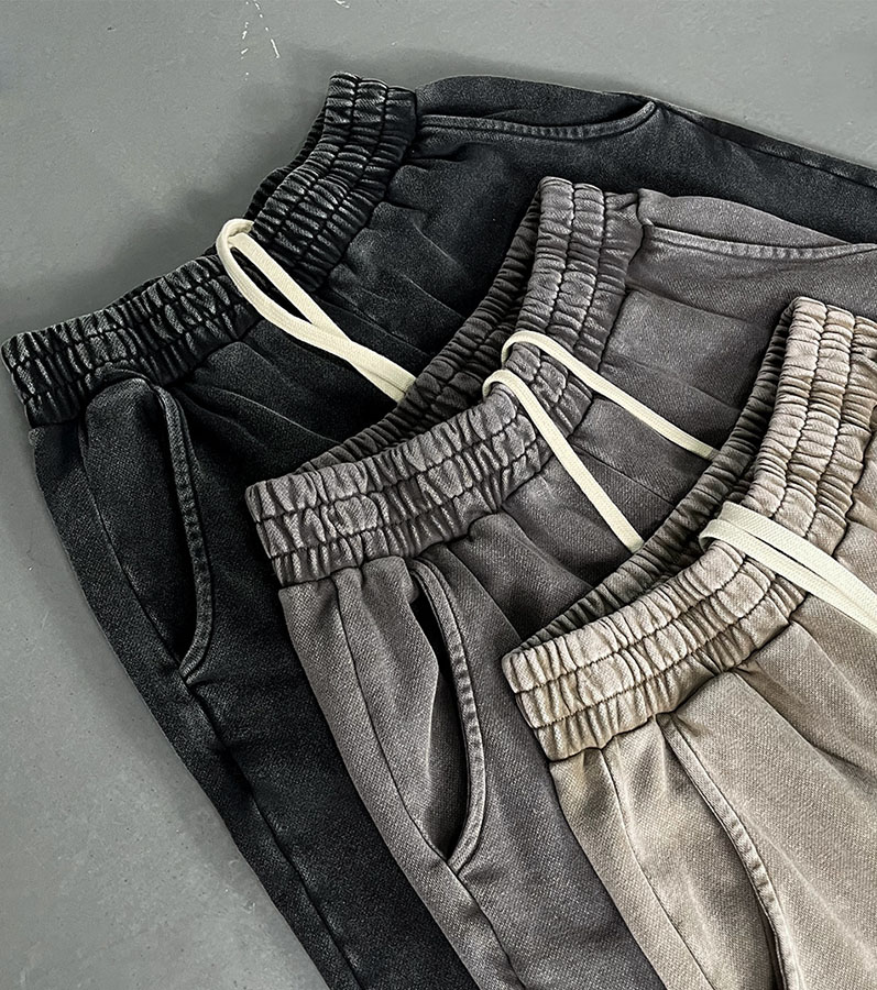 These vintage-style sweatpants offer a wide-leg fit with distressed wash and side patchwork seam details. The heavyweight cotton build ensures a structured yet comfortable silhouette with a retro edge.