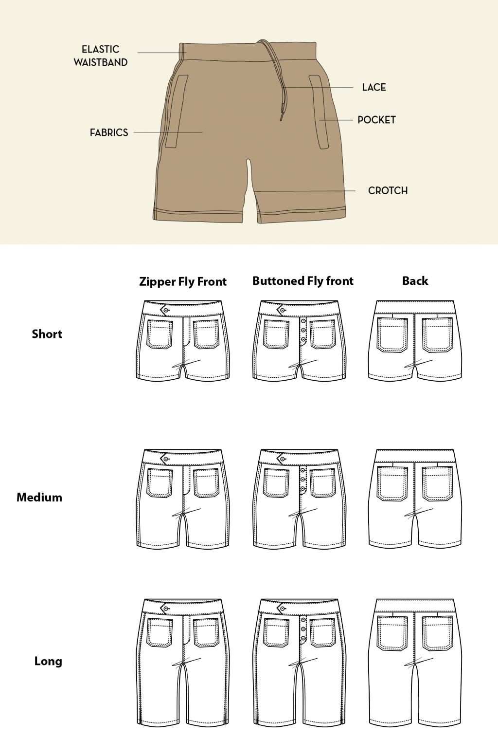 Fly: The fly is the opening at the front of the shorts, allowing for easy wear and removal. The fly can be secured with a zipper, buttons, or hook-and-loop closures. In some styles, especially elastic-waist shorts, the fly might be non-functional or omitted.