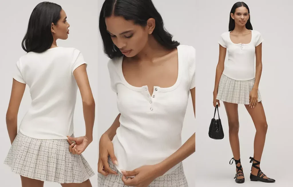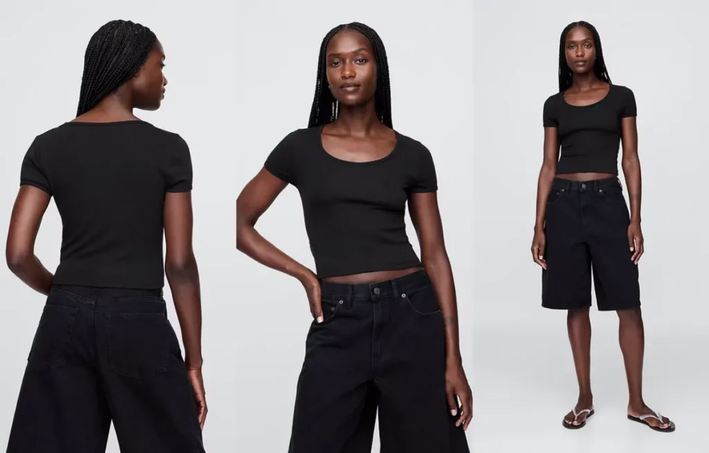 - Contrasting sleeves (short over long) for a built-in stacked effect