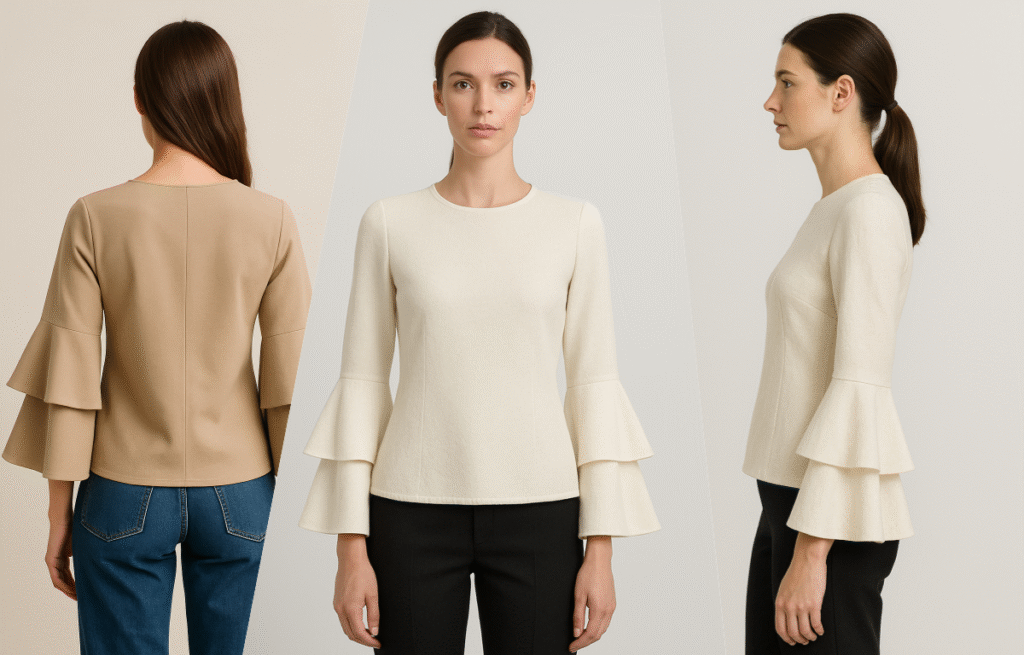 I’ve helped clients use this sleeve to soften structured garments. It gives volume in a controlled way—stylish, not overwhelming.