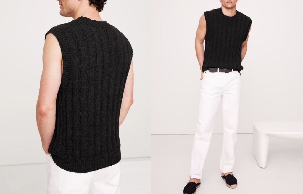 The V-neck vest features a pointed neckline and is typically constructed from knit or jersey fabric. It’s a classic layering piece used in preppy, professional, and minimalist styles.